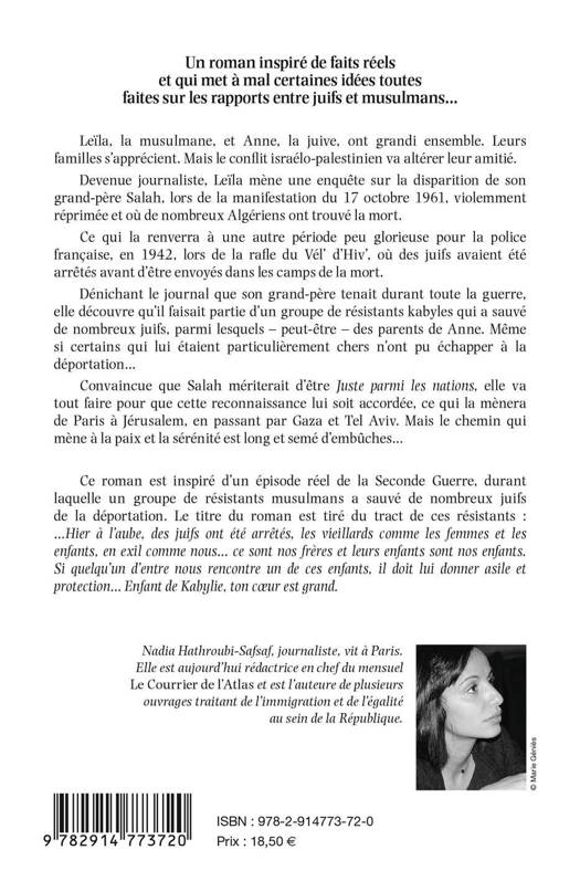 Ce roman est inspiré d'un épisode réel de la Seconde Guerre, durant laquelle un groupe de résistants musulmans a sauvé de nombreux juifs de la déportation. Le titre du roman est tiré du tract de ces résistants : ...Hier à l'aube, des juifs ont été arrêtés, les vieillards comme les femmes et les enfants, en exil comme nous... ce sont nos frères et leurs enfants sont nos enfants. Si quelqu'un d'entre nous rencontre un de ces enfants, il doit lui donner asile et protection... Enfant de Kabylie, ton coeur est grand.