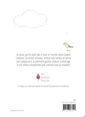 Célestin est un drôle d'oiseau. Quand il fait beau, il ouvre son parapluie, quand il pleut, il le ferme. Son étrange comportement fait causer les passants mais, en cachette, ils commencent à l'imiter et même à s'amuser ! Un album qui traite avec poésie et humour de l'autre et de sa différence.