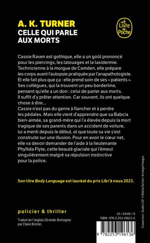 Cassie Raven est gothique, elle a un goût prononcé pour les piercings, les tatouages et la taxidermie. Technicienne à la morgue de Camden, elle prépare les corps avant l’autopsie pratiquée par l’anapathologiste. Et elle fait plus que ça : elle prend soin de ses « patients ». Ses collègues, qui la trouvent un peu borderline, pensent qu’elle a un don : celui de parler aux morts. Il suffit d’y prêter attention. Car souvent, ils ont quelque chose à dire... Cassie n’est pas du genre à flancher et à perdre les pédales. Mais elle vient d’apprendre que sa grand-mère bienaimée, sa Babcia qui l’a élevée depuis la mort tragique de ses parents dans un accident de voiture, lui a menti depuis le début, et que toute sa vie s’est construite sur un mensonge. Pour en avoir le cœur net, elle va devoir demander de l’aide à la lieutenante Phyllida Flyte, cette beauté glaciale qui l’émeut singulièrement malgré sa répulsion instinctive pour la police.