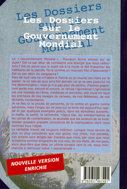 Le « Gouvernement Mondial »… Pourquoi écrire encore sur ce sujet ? Est-ce par désir de combattre une énergie que nous redoutons ? Est-ce parce que le sujet est à la mode et fait frissonner les habitants de la planète Terre comme un mauvais film d’épouvante ? Est-ce par désir de vengeance ? Rien de tout cela ne m’habite à l’heure où je couche ces mots sur le papier. Je ne sais de quoi sera fait demain car je ne sais jusqu’où ira ma détermination ; mais je n’ai pas peur de perdre, d’autres gagneront après moi, encore et encore. Je refuse l’ignorance ! L’ignorance est une maladie de l’âme, insidieuse et perverse, elle coule en nous les prémices de nos lavages de cerveau, de nos faiblesses, de nos lâchetés involontaires. Je ne fais ici le procès de personne, je ne rentre en guerre contre personne, mais l’enjeu qui se joue sur la terre est aujourd’hui capital et par quelques exemples précis, dans les domaines suivants : la mafia, la santé, la recherche, l’Opus Dei, les extraterrestres et les camps de concentration, je souhaite que les lecteurs de ce livre-dossier puissent prendre conscience de la manipulation dont nous sommes tous l’objet. Le véritable travail est toujours intérieur. Lorsque nous serons de plus en plus conscients que nos goûts, nos choix, nos pensées, nos actions sont dirigés par d’autres que nous, par ceux que nous acceptons comme dirigeants de nos vies, de nos états, de nos pays, alors peut-être que dans un ultime sursaut vers la vie, nous chercherons à retrouver notre « souveraineté ».