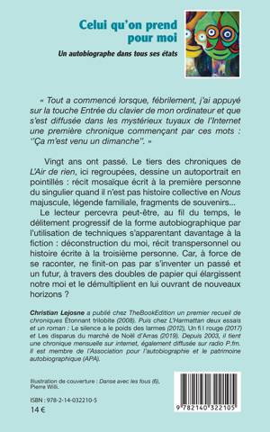 « Tout a commencé lorsque, fébrilement, j'ai appuyé sur la touche Entrée du clavier de mon ordinateur et que s'est diffusée dans les mystérieux tuyaux de l'Internet une première chronique commençant par ces mots : ''Ça m'est venu un dimanche''. » Vingt ans ont passé. Le tiers des chroniques de L'Air de rien, ici regroupées, dessine un autoportrait en pointillés : récit mosaïque écrit à la première personne du singulier quand il n'est pas histoire collective en Nous majuscule, légende familiale, fragments de souvenirs... Le lecteur percevra peut-être, au fil du temps, le délitement progressif de la forme autobiographique par l'utilisation de techniques s'apparentant davantage à la fiction : déconstruction du moi, récit trans-personnel ou histoire écrite à la troisième personne. Car, à force de se raconter ne finit-on pas par s'inventer un passé et un futur, à travers des doubles de papier qui élargissent notre moi et le démultiplient en lui ouvrant de nouveaux horizons ?