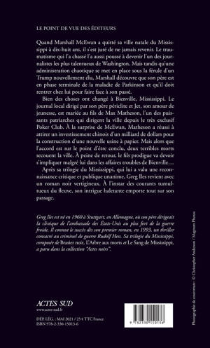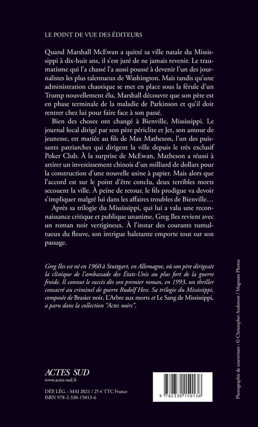Quand Marshall McEwan a quitté sa ville natale du Mississippi à dix-huit ans, il s'est juré de ne jamais revenir. Le traumatisme qui l'a chassé l'a aussi poussé à devenir l'un des journalistes les plus talentueux de Washington. Mais tandis qu'une administration chaotique se met en place sous la férule d'un Trump nouvellement élu, Marshall découvre que son père est en phase terminale de la maladie de Parkinson et qu'il doit rentrer chez lui pour faire face à son passé. Bien des choses ont changé à Bienville, Mississippi. Le journal local dirigé par son père périclite et Jet, son amour de jeunesse, est mariée au fi ls de Max Matheson, l'un des puissants patriarches qui dirigent la ville depuis le très exclusif Poker Club. À la surprise de McEwan, Matheson a réussi à attirer un investissement chinois d'un milliard de dollars pour la construction d'une nouvelle usine à papier. Mais alors que l'accord est sur le point d'être conclu, deux terribles morts secouent la ville. À peine de retour, le fi ls prodigue va devoir s'impliquer malgré lui dans les affaires troubles de Bienville... Après sa trilogie du Mississippi, qui lui a valu une reconnaissance critique et publique unanime, Greg Iles revient avec un roman noir vertigineux. À l'instar des courants tumultueux du fleuve, son intrigue haletante emporte tout sur son passage.