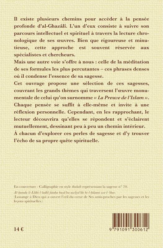 Il existe plusieurs chemins pour accéder à la pensée profonde d’al-Ghazâlî. L’un d’eux consiste à suivre son parcours intellectuel et spirituel à travers la lecture chronologique de ses œuvres. Bien que rigoureuse et minutieuse, cette approche est souvent réservée aux spécialistes et chercheurs. Mais une autre voie s’offre à nous : celle de la méditation de ses formules les plus percutantes – ces phrases denses où il condense l’essence de sa sagesse. Cet ouvrage propose une sélection de ces sagesses, couvrant les grands thèmes qui traversent l’œuvre monumentale de celui qu’on surnomme « La Preuve de l’Islam ». Chaque pensée se suffit à elle-même et invite à une réflexion personnelle. Cependant, en les rapprochant, le lecteur découvrira qu’elles se répondent et s’éclairent mutuellement, dessinant peu à peu un chemin intérieur. À chacun d’explorer ces perles de sagesse et d’y trouver l’écho de sa propre quête spirituelle.