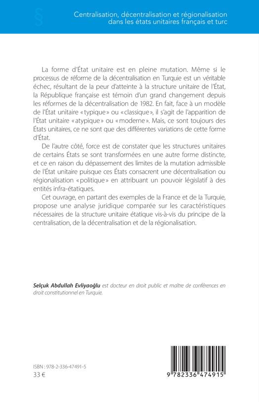 La forme d'État unitaire est en pleine mutation. Même si le processus de réforme de la décentralisation en Turquie est un véritable échec, résultant de la peur d'atteinte à la structure unitaire de l'État, la République française est témoin d'un grand changement depuis les réformes de la décentralisation de 1982. En fait, face à un modèle de l'État unitaire typique ou classique, il s'agit de l'apparition de l'État unitaire atypique ou moderne . Mais, ce sont toujours des États unitaires, ce ne sont que des différentes variations de cette forme d'État. De l'autre côté, force est de constater que les structures unitaires de certains États se sont transformées en une autre forme distincte, et ce en raison du dépassement des limites de la mutation admissible de l'État unitaire puisque ces États consacrent une décentralisation ou régionalisation politique en attribuant un pouvoir législatif à des entités infra-étatiques. Cet ouvrage, en partant des exemples de la France et de la Turquie, propose une analyse juridique comparée sur les caractéristiques nécessaires de la structure unitaire étatique vis-à-vis du principe de la centralisation, de la décentralisation et de la régionalisation.