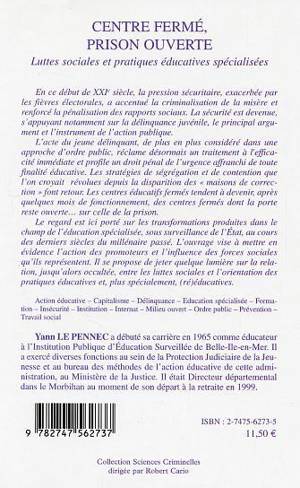 La sécurité est devenue, s'appuyant notamment sur la délinquance juvénile, un argument fort de l'action publique. Les stratégies de ségrégation que l'on croyait révolues depuis la disparition des "maisons de correction" font retour. Les centres éducatifs tendent à devenir des centres fermés dont la porte reste ouverte…sur celle de la prison. Le regard est porté sur les transformations produites dans le champ de l'éducation spécialisée, sous surveillance de l’État, au cours des derniers siècles. L'ouvrage jette quelques lumières sur la relation entre les luttes sociales et l'orientation des pratiques éducatives.