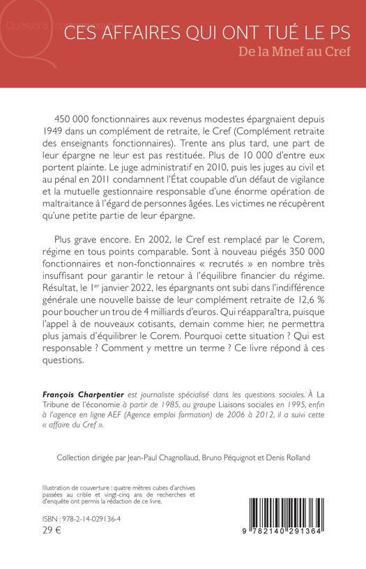 450 000 fonctionnaires aux revenus modestes épargnaient depuis 1949 dans un complément de retraite, le Cref (Complément retraite des enseignants fonctionnaires). Trente ans plus tard, une part de leur épargne ne leur est pas restituée. Plus de 10 000 d'entre eux portent plainte. Le juge administratif en 2010, puis les juges au civil et au pénal en 2011 condamnent l'État coupable d'un défaut de vigilance et la mutuelle gestionnaire responsable d'une énorme opération de maltraitance à l'égard de personnes âgées. Les victimes ne récupèrent qu'une petite partie de leur épargne. Plus grave encore. En 2002, le Cref est remplacé par le Corem, régime en tous points comparable. Sont à nouveau piégés 350 000 fonctionnaires et non-fonctionnaires « recrutés » en nombre très insuffisant pour garantir le retour à l'équilibre financier du régime. Résultat, le 1er janvier 2022, les épargnants ont subi dans l'indifférence générale une nouvelle baisse de leur complément retraite de 12,6 % pour boucher un trou de 4 milliards d'euros. Qui réapparaîtra, puisque l'appel à de nouveaux cotisants, demain comme hier, ne permettra plus jamais d'équilibrer le Corem. Pourquoi cette situation ? Qui est responsable ? Comment y mettre un terme ? Ce livre répond à ces questions.