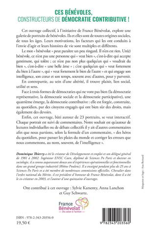 Cet ouvrage dresse le portrait de bénévoles de toutes origines sociales, de tous les âges. Le bénévolat n’est pas ringard : le bénévole n’est pas une « belle âme » mais quelqu’un qui « veut fortement du bien à l’autre » et qui engage son intelligence, son coeur et son temps pour y parvenir. En contrepartie, il trouve plaisir, lien social, utilité et sens. Face aux démocraties représentative, sociale et participative qui ne vont pas bien, une quatrième émerge : la démocratie contributive, faite par des citoyens engagés.