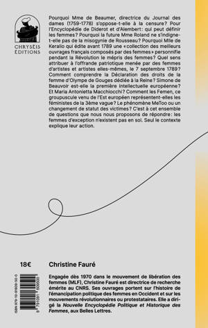 Pourquoi Mme de Beaumer, directrice du Journal des dames (1759-1778) s’oppose-t-elle à la censure? Pour l’Encyclopédie de Diderot et d’Alembert : qui peut définir les femmes? Pourquoi la future Mme Roland ne s’indigne-t-elle pas de la misogynie de Rousseau? Pourquoi Mlle de Keralio qui édite avant 1789 une « collection des meilleurs ouvrages français composés par des femmes » personnifie pendant la Révolution le mépris des femmes? Quel sens attribuer à l’offrande patriotique menée par des femmes d’artistes et artistes elles-mêmes, le 7 septembre 1789? Comment comprendre la Déclaration des droits de la femme d’Olympe de Gouges dédiée à la Reine? Simone de Beauvoir est-elle la première intellectuelle européenne? Et Maria Antonietta Macchiocchi? Comment les Femen, ce groupuscule venu de l’Est européen représentent-elles les féministes de la 3ème vague? Le phénomène MeToo ou un changement de statut des victimes? C’est à cet ensemble de questions que nous nous proposons de répondre : les femmes d’exception n’existent pas en soi. Seul le contexte explique leur action.