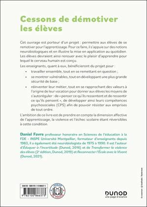 Cet ouvrage est porteur d’un projet : permettre aux élèves de se remotiver pour l’apprentissage. Pour ce faire, il s’appuie sur des notions neurobiologiques et en illustre la mise en application au quotidien. Les élèves devraient ainsi renouer avec le plaisir d’apprendre pour lequel le cerveau humain est conçu. Les enseignants, quant à eux, bénéficieront du projet pour : • travailler ensemble, tout en se remettant en question ; • se montrer vulnérables, tout en développant une plus grande sécurité de base ; • réinventer leur métier, tout en se rapprochant des valeurs à l’origine de leur vocation pour donner aux élèves les moyens de s’autoréguler : de « penser ce qu’ils ressentent et de ressentir ce qu’ils pensent », de développer ainsi leurs compétences psychosociales (CPS) afin de pouvoir résister aux emprises de tout ordre. L’ambition de ce livre est de prendre en compte la dimension affective de l’apprentissage, la violence et l’échec scolaire étant réversibles à cette condition.