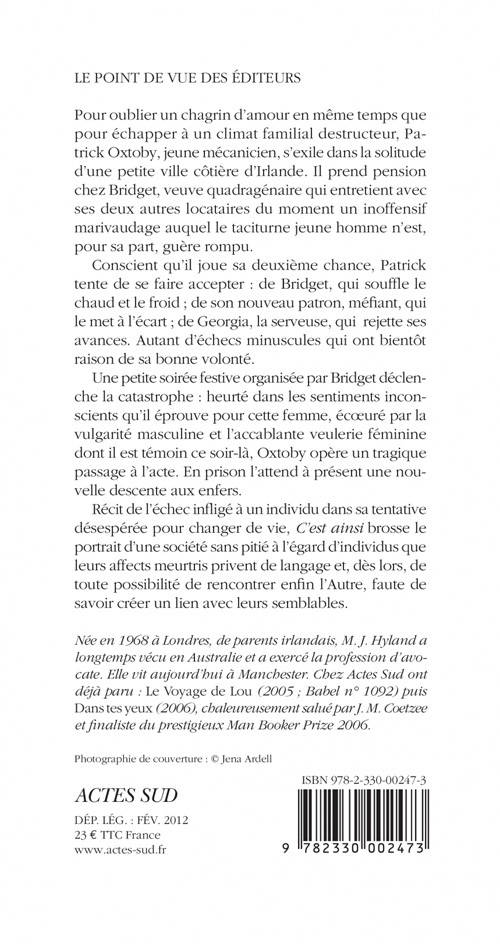 Récit de l'échec infligé à un individu dans sa tentative désespérée pour changer de vie, «C'est ainsi» brosse le portrait d'une société sans pitié à l'égard d'individus que leurs affects meurtris privent de langage et, dès lors, de toute possibilité de rencontrer enfin l'Autre, faute de savoir créer un lien avec leurs semblables.