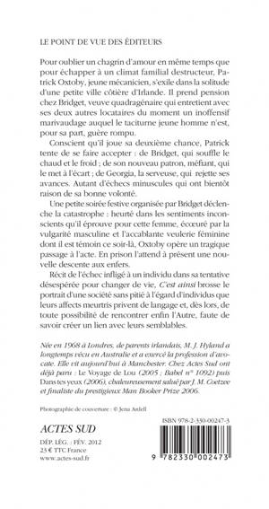Pour oublier un chagrin d'amour en même temps que pour échapper à un climat familial destructeur, Patrick Oxtoby, jeune mécanicien, s'exile dans la solitude d'une petite ville côtière d'Irlande. Il prend pension chez Bridget, veuve quadragénaire qui entretient avec ses deux autres locataires du moment un inoffensif marivaudage auquel le taciturne jeune homme n'est, pour sa part, guère rompu.