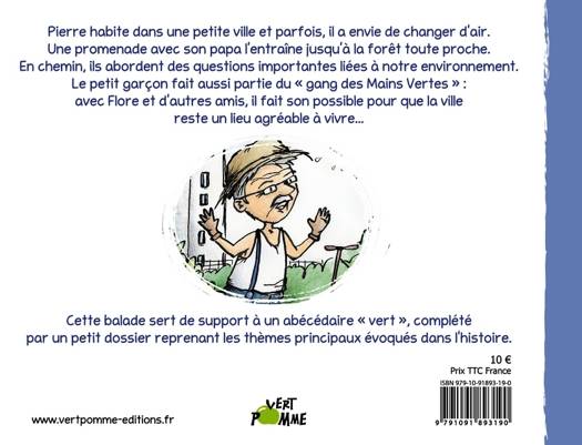 Pierre habite dans une petite ville et parfois, il a envie de changer d'air. Une promenade avec son papa l'entraîne jusqu'à la forêt toute proche. En chemin, ils abordent des questions importantes liées à notre environnement. Le petit garçon fait aussi partie du « gang des Mains Vertes » : avec Flore et d’autres amis, il fait son possible pour que la ville reste un lieu agréable à vivre... Cette balade sert de support à un abécédaire « vert », complété par un petit dossier reprenant les thèmes principaux évoqués dans l'histoire. Conseillé à partir de 5 ans.