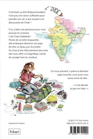 En 2016, Clara Vialletelle décide de partir à l'aventure avec un sac à dos, une boîte d'aquarelles et de multiples carnets de dessin vierges. Sa destination ? L'Inde et son architecture à couper le souffle, sa population souriante aux tenues colorées et sa cuisine aux multiples saveurs. Au fil de son voyage et de ses rencontres, Clara Vialletelle remplit ses carnets de magnifiques dessins, mais aussi de collages et de précieuses notes afin de garder une trace de ses impressions et sensations au moment où elles les vit. Préparatifs du voyage, missions de volontariat, fêtes traditionnelles, visites de lieux somptueux et aventures en road trip, chaque moment est retranscrit et regroupé dans C'est décidé, je pars en Inde !