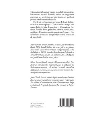 «Peter Turrini, né en Carinthie en 1944, vit de sa plume depuis 1971. Installé à Retz, il écrit des pièces, des poèmes et des essais. Dès sa première pièce, Tango viennois (Actes Sud-Papiers, 1986), il soulève la polémique du fait de sa virulente critique sociale. Les éditions Actes Sud-Papiers ont publié une dizaine de ses pièces. »