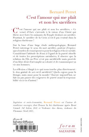 "C'est l'amour qui me plaît et non les sacrifices." Ce verset d'Osée s'accorde à la vision d'un Christ qui libère avec force les animaux du Temple destinés au sacrifice. Pourtant, le sacrifice de la Croix n'est-il pas central dans la religion chrétienne ? Sur la base d'une large étude anthropologique, Bernard Perret interroge le sens du mot sacrifice, porteur d'équivoques lourdes de conséquences pour la religion et la vie sociale. Considérant l'attitude de Jésus à l'égard de la pureté rituelle et de toutes les prescriptions sacralisées, il observe que la relation du Fils au Père n'est pas sacrificielle mais procède d'un libre désir d'accomplir sa volonté et de communiquer sa vie aux hommes. La réflexion s'élargit à ce qui nous touche plus directement : le don gratuit de soi est-il sacrificiel ? Quels enjeux pour la liturgie, mais aussi pour la morale ? Encore aujourd'hui, ne fait-on pas passer des exigences de pureté avant la responsabilité vis-à-vis d'autrui ?