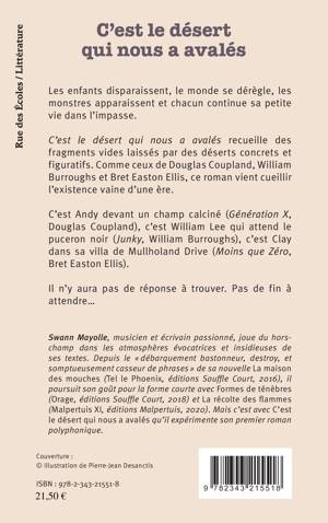 Les enfants disparaissent, le monde se dérègle, les monstres apparaissent et chacun continue sa petite vie dans l'impasse. C'est le désert qui nous a avalés recueille des fragments vides laissés par des déserts concrets et figuratifs. Comme ceux de Douglas Coupland, William Burroughs et Bret Easton Ellis, ce roman vient cueillir l'existence vaine d'une ère.