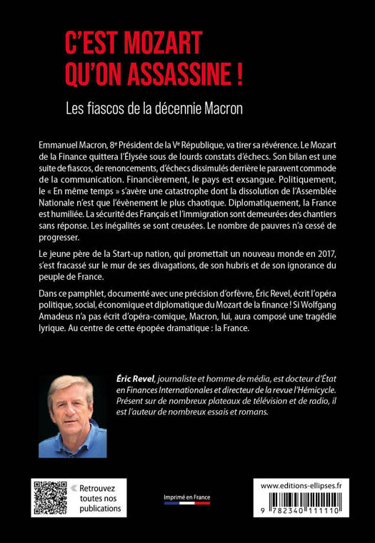 Dans ce pamphlet, documenté avec une précision d’orfèvre, Éric Revel , chapitre après chapitre, en reprenant les grandes pièces musicales de Wolfgang Amadeus Mozart, écrit l’opéra politique, social, économique et diplomatique du « Mozart de la finance » ! « Wolfie » n'a pas écrit d’« opéra-comique ». Macron, lui, aura composé une « tragédie lyrique ». Au centre de cette épopée dramatique : la France.