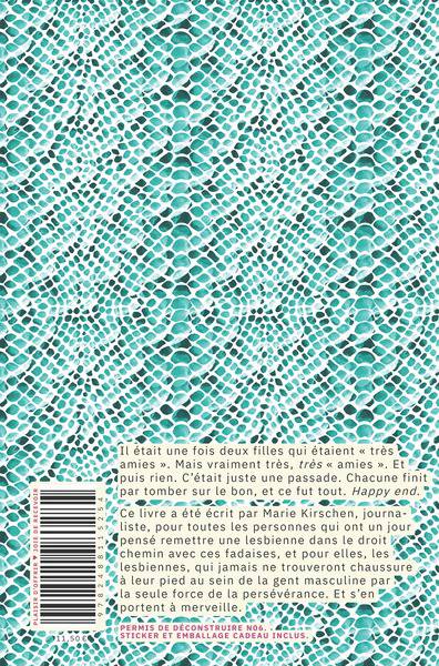 Ce livre a été écrit par Marie Kirschen, journaliste, pour toutes les personnes qui ont un jour pensé remettre une lesbienne dans le droit chemin avec ces fadaises, et pour elles, les lesbiennes, qui jamais ne trouveront chaussure à leur pied au sein de la gent masculine par la seule force de la persévérance. Et s’en portent à merveille.