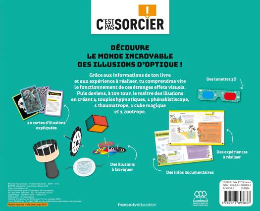 Puis deviens, à ton tour, le maître des illusions en créant 4 toupies hypnotiques, 1 phénakistiscope, 1 thaumatrope, 1 cube magique et 1 zoetrope.