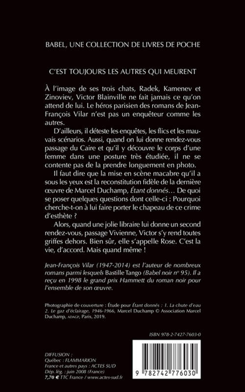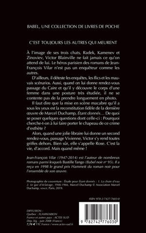 A l'image de ses trois chats, Radek, Kamenev et Zinoviev, Victor Blainville ne fait jamais ce qu'on attend de lui. Le héros parisien des romans de Jean- François Vilar n'est pas un enquêteur comme les autres. D'ailleurs, il déteste les enquêtes, les flics et les mauvais scénarios. Aussi, quand on lui donne rendezvous passage du Caire et qu'il y découvre le corps d'une femme dans une posture très étudiée, il ne se contente pas de la prendre longuement en photo. Il faut dire que la mise en scène macabre qu'il a sous les yeux est la reconstitution fidèle de la dernière oeuvre de Marcel Duchamp, Etant donnés... De quoi se poser quelques questions dont celle-ci : Pourquoi cherche-t-on à lui faire porter le chapeau de ce crime d'esthète ? Alors, quand une jolie libraire lui donne un second rendez-vous, passage Vivienne, Victor s'y rend toutes griffes dehors. Bien sûr, elle s'appelle Rose. C'est la vie, d'accord. Mais quand même ! «Jean-François Vilar, né en 1947, a publié une dizaine de romans dont Bastille Tango (Presses de la Renaissance et Babel noir), Les Exagérés et Nous cheminons entourés de fantômes aux fronts troués (Le Seuil). Il est traduit dans une dizaine de langues.»