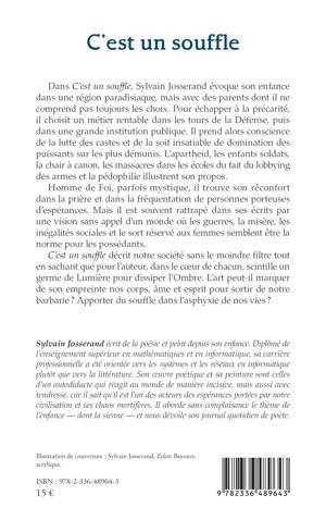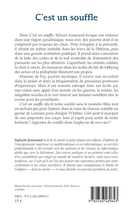 Dans C'est un souffle, Sylvain Josserand évoque son enfance dans une région paradisiaque, mais avec des parents dont il ne comprend pas toujours les choix. Pour échapper à la précarité, il choisit un métier rentable dans les tours de la Défense, puis dans une grande institution publique. Il prend alors conscience de la lutte des castes et de la soif insatiable de domination des puissants sur les plus démunis. L'apartheid, les enfants soldats, la chair à canon, les massacres dans les écoles du fait du lobbying des armes et la pédophilie illustrent son propos. Homme de Foi, parfois mystique, il trouve son réconfort dans la prière et dans la fréquentation de personnes porteuses d'espérances. Mais il est souvent rattrapé dans ses écrits par une vision sans appel d'un monde où les guerres, la misère, les inégalités sociales et le sort réservé aux femmes semblent être la norme pour les possédants. C'est un souffle décrit notre société sans le moindre filtre tout en sachant que pour l'auteur, dans le coeur de chacun, scintille un germe de Lumière pour dissiper l'Ombre. L'art peut-il marquer de son empreinte nos corps, âme et esprit pour sortir de notre barbarie ? Apporter du souffle dans l'asphyxie de nos vies ?