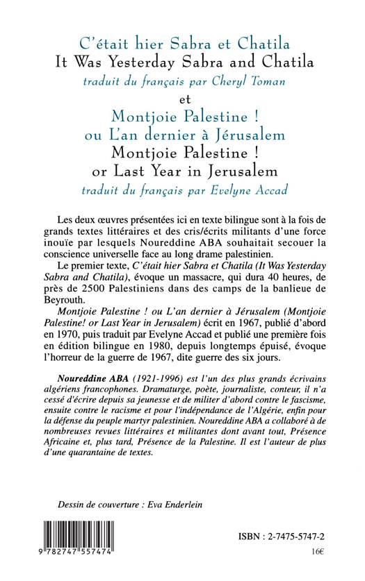 Il s'agit ici d'un texte bilingue à la fois de grands textes littéraires et des cris/écrits militants d'une force inouïe par lesquels l'auteur souhaitait secouer la conscience universelle face au long drame palestinien. Le premier texte évoque un massacre qui dura 40 heures de près de 2500 palestiniens dans des camps de la banlieue de Beyrouth et le deuxième écrit en 1967 et épuisé, republié évoque l'horreur de la guerre de 1967, dite guerre des six jours.