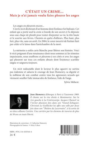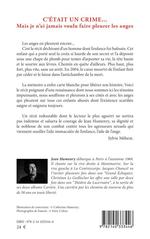 Les anges en pleurent encore... C'est le récit déchirant d'un homme dont l'enfance fut bafouée. Cet enfant qui a porté seul la croix si lourde de son secret et l'a déposée sous une chape de plomb pour tenter d'arpenter sa vie, la tête haute et le sourire aux lèvres. Chemin en quête d'ailleurs. Plus haut, plus fort, plus vite, sans un arrêt. En 2004, le cœur meurtri de l'enfant finit par céder et le laisse dans l'antichambre de la mort. La mémoire a enfin carte blanche pour libérer son histoire. Voici le récit poignant d'une renaissance dont nous sommes ici les témoins impuissants, nous souffrons et pleurons à ses côtés et avec les anges qui pleurent sur tous ces enfants abusés dont l'existence scarifiée saigne et saignera toujours. Un récit redoutable dont le lecteur le plus aguerri ne sortira pas indemne et saluera le courage de Jean Humenry, sa dignité et la noblesse de son combat contre tous les agresseurs sexuels qui viennent souiller l'aile immaculée de l'enfance, l'aile de l'ange.