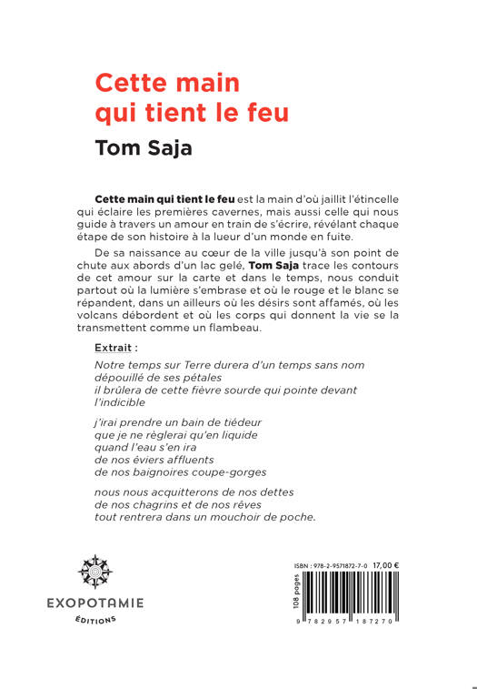 "Cette main qui tient le feu" est la main d’où jaillit l’étincelle qui éclaire les premières cavernes, mais aussi celle qui nous guide à travers un amour en train de s’écrire, révélant chaque étape de son histoire à la lueur d’un monde en fuite. De sa naissance au cœur de la ville jusqu’à son point de chute aux abords d’un lac gelé, Tom Saja trace les contours de cet amour sur la carte et dans le temps, nous conduit partout où la lumière s’embrase et où le rouge et le blanc se répandent, dans un ailleurs où les désirs sont affamés, où les volcans débordent et où les corps qui donnent la vie se la transmettent comme un flambeau.