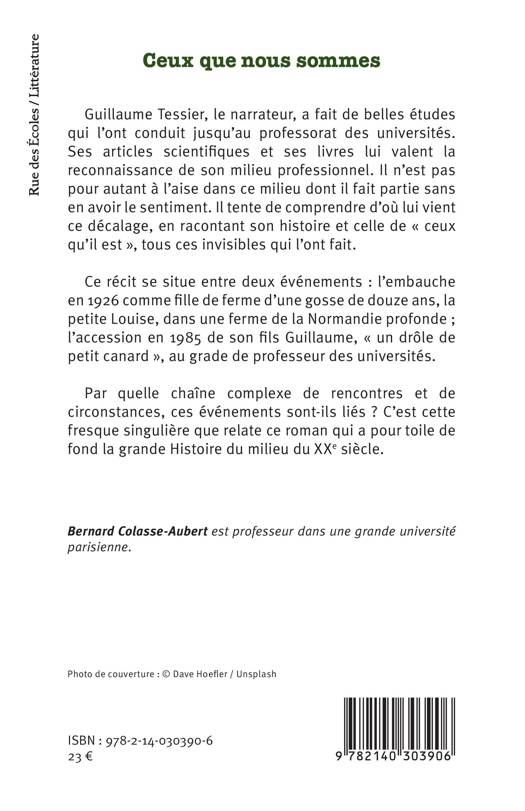 Guillaume Tessier, le narrateur, a fait de belles études qui l'ont conduit jusqu'au professorat des universités. Ses articles scientifiques et ses livres lui valent la reconnaissance de son milieu professionnel. Il n'est pas pour autant à l'aise dans ce milieu dont il fait partie sans en avoir le sentiment. Il tente de comprendre d'où lui vient ce décalage, en racontant son histoire et celle de « ceux qu'il est », tous ces invisibles qui l'ont fait. Ce récit se situe entre deux événements : l'embauche en 1926 comme fille de ferme d'une gosse de douze ans, la petite Louise, dans une ferme de la Normandie profonde ; l'accession en 1985 de son fils Guillaume, « un drôle de petit canard », au grade de professeur des universités. Par quelle chaîne complexe de rencontres et de circonstances, ces événements sont-ils liés ? C'est cette fresque singulière que relate ce roman qui a pour toile de fond la grande Histoire du milieu du XXe siècle.