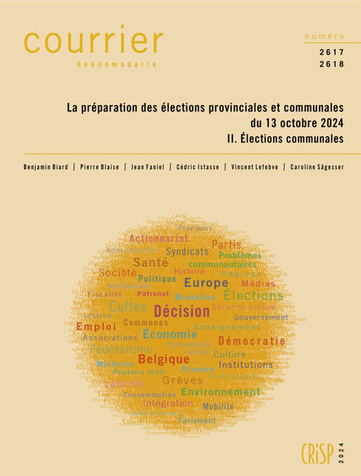 Le 13 octobre 2024 auront lieu les élections communales et provinciales. Elles mèneront au renouvellement de plusieurs centaines d’organes locaux : l’ensemble des conseils communaux et des collèges communaux (ou collèges des bourgmestre et échevins) du pays, l’ensemble des conseils provinciaux et collèges provinciaux (ou députations) de Wallonie et de Flandre, et l’ensemble des conseils et collèges de district de la commune d’Anvers. Le même jour, se déroulera également l’élection directe des conseils du CPAS dans huit communes à facilités – les autres étant renouvelés dans la foulée du scrutin communal, à l’instar d’autres institutions telles que les organes dirigeants des zones de police ou ceux des intercommunales. Ce deuxième volume du Courrier hebdomadaire consacré à la préparation de ce scrutin se concentre sur les élections communales, successivement en Wallonie francophone, en Région bruxelloise, dans les communes de la périphérie bruxelloise et de la frontière linguistique, en Flandre et en Communauté germanophone. Pour chacun de ces cinq espaces, le CRISP passe en revue la situation politique issue des élections communales du 14 octobre 2018 (en rappelant notamment le poids des partis tel qu’il apparaissait au lendemain de ce scrutin), avant de proposer une approche globale des listes de candidats déposées en vue du scrutin du 13 octobre 2024. Les commentaires des candidatures attirent l’attention sur les stratégies des partis politiques dans la confection de leurs listes : présence de personnalités en ordre utile ou non, présence de mandataires ou d’élus régionaux ou nationaux du parti en vue de bénéficier de leur notoriété, etc.