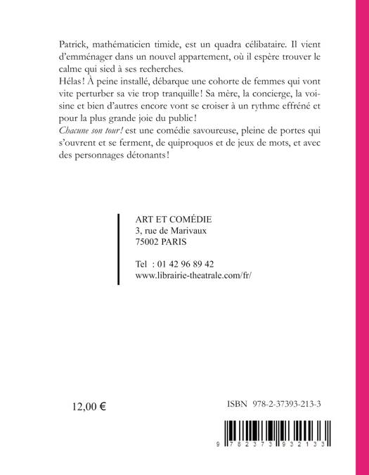 Patrick, mathématicien timide, est un quadra célibataire. Il vient d'emménager dans un nouvel appartement, où il espère trouver le calme qui sied à ses recherches. Hélas ! À peine installé, débarque une cohorte de femmes qui vont vite perturber sa vie trop tranquille ! Sa mère, la concierge, la voisine et bien d'autres encore vont se croiser à un rythme effréné et pour la plus grande joie du public ! Chacune son tour ! est une comédie savoureuse, pleine de portes qui s'ouvrent et se ferment, de quiproquos et de jeux de mots, et avec des personnages détonnants !