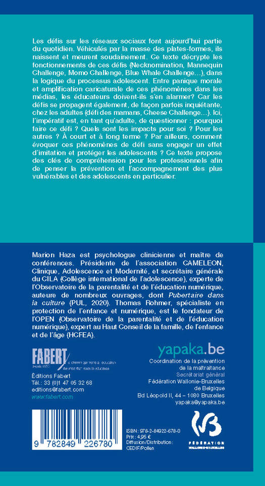 Les défis sur les réseaux sociaux font aujourd’hui partie du quotidien. Véhiculés par la masse des plates-formes, ils naissent et meurent soudainement. Ce texte décrypte les fonctionnements de ces défis (Necknomination, Mannequin Challenge, Momo Challenge, Blue Whale Challenge...) dans la logique du processus adolescent. Entre panique morale et amplification caricaturale de ces phénomènes dans les médias, les éducateurs doivent-ils s’en alarmer? Car les défis se propagent également, de façon parfois inquiétante, chez les adultes (défi des mamans, Cheese Challenge...). Ici, l’impératif est, en tant qu’adulte, de questionner : pourquoi faire ce défi ? Quels sont les impacts pour soi ? Pour les autres ? À court et à long terme ? Par ailleurs, comment évoquer ces phénomènes de défi sans engager un effet d’imitation et protéger les adolescents ? Ce texte propose des clés de compréhension pour les professionnels afin de penser la prévention et l’accompagnement des plus vulnérables et des adolescents en particulier.