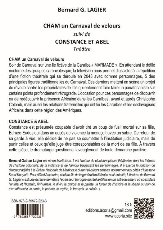 CHAM un Carnaval de velours Soir de Carnaval sur une île fictive de la Caraïbe « MARMADE ». En attendant le défilé nocturne des groupes carnavalesque, la télévision nous permet d’assister à la répétition d’une fiction théâtrale qui se déroule en 2043 avec comme personnages, 5 des principales figures traditionnelles du Carnaval. Ces derniers mettent en scène un projet de révolte contre les propriétaires de l’île qui entendent faire taire un panafricaniste sur certains points profondément rétrograde. L’occasion pour ces personnages de découvrir ou de redécouvrir la présence Africaine dans les Caraïbes, avant et après Christophe Colomb, mais aussi les relations fraternelles qui ont lié les Caraïbes et les esclavagisés Africains dans cette région des Amériques.