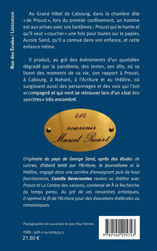 Au Grand Hôtel de Cabourg, dans la chambre dite « de Proust », lors du premier confinement, un homme est aux prises avec ses fantômes : Proust qui le hante et qu’il veut « coucher » une fois pour toutes sur le papier, Aurore Sand, qu’il a connue dans son enfance, et cette enfance même. Il produit, au gré des événements d’un quotidien dégradé par la pandémie, des textes, ses dits, où se lisent des moments de sa vie, son rapport à Proust, à Cabourg, à Nohant, à l’écriture et au théâtre, où surgissent aussi des personnages et des voix qui l’ont accompagné et qui vont se retrouver lors d’un « bal des spectres » très encombré.
