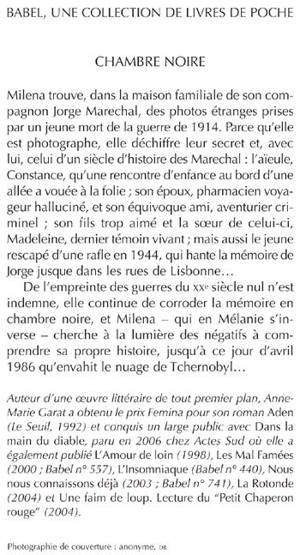 Milena trouve, dans la maison familiale de son compagnon Jorge Marechal, des photos étranges prises par un jeune mort de la guerre de 1914. Parce qu'elle est photographe, elle déchiffre leur secret et, avec lui, celui d'un siècle d'histoire des Marechal : l'aïeule, Constance, qu'une rencontre d'enfance au bord d'une allée a vouée à la folie ; son époux, pharmacien voyageur halluciné, et son équivoque ami, aventurier criminel ; son fils trop aimé et la soeur de celui-ci, Madeleine, dernier témoin vivant ; mais aussi le jeune rescapé d'une rafle en 1944, qui hante la mémoire de Jorge jusque dans les rues de Lisbonne... De l'empreinte des guerres du XXe siècle nul n'est indemne, elle continue de corroder la mémoire en chambre noire, et Milena - qui en Mélanie s'inverse - cherche à la lumière des négatifs à comprendre sa propre histoire, jusqu'à ce jour d'avril 1986 qu'envahit le nuage de Tchernobyl... Auteur d'une oeuvre littéraire de tout premier plan, Anne- Marie Garat a obtenu le prix Femina pour son roman Aden (Le Seuil, 1992) et conquis un large public avec Dans la main du diable, paru en 2006 chez Actes Sud où elle a également publié L'Amour de loin (1998), Les Mal Famées (2000 ; Babel n° 557), L'Insomniaque (Babel n° 440), Nous nous connaissons déjà (2003 ; Babel n° 741), La Rotonde (2004) et Une faim de loup. Lecture du "Petit Chaperon rouge" (2004).