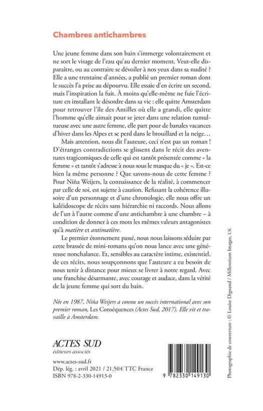 Mais attention, nous dit l'auteure, ceci n'est pas un roman ! D'étranges contradictions se glissent dans le récit des aventures tragicomiques de celle qui est tantôt présentée comme « la femme » et tantôt s'adresse à nous sous le masque du « je ». Est-ce bien la même personne ? Que savons-nous de cette femme ? Pour Niña Weijers, la connaissance de la réalité, à commencer par celle de soi, est sujette à caution. Refusant la cohérence illusoire d'un personnage et d'une chronologie, elle nous offre un kaléidoscope de récits sans hiérarchie ni raccords. Nous allons de l'un à l'autre comme d'une antichambre à une chambre - à condition de donner à ces mots les mêmes valeurs antagonistes qu'à «matière» et «antimatière».
