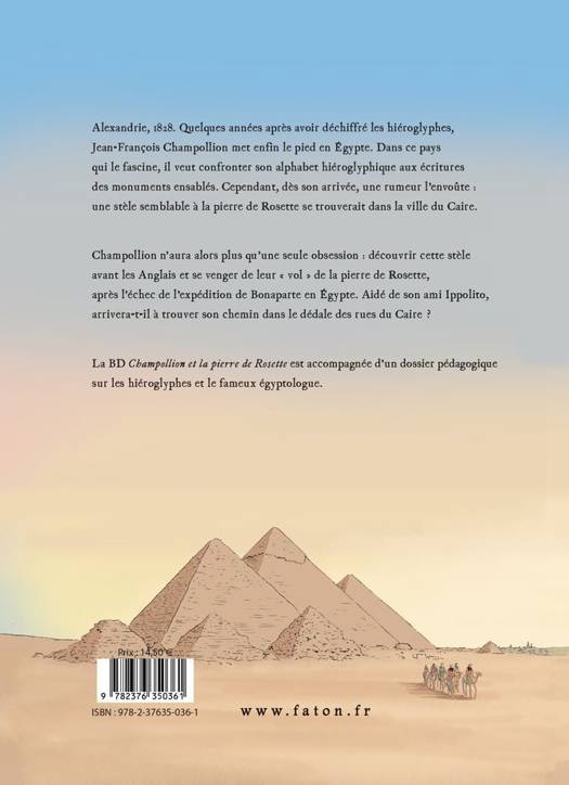 Après avoir déchiffré les hiéroglyphes en 1822 grâce à la Pierre de Rosette, Champollion réalise enfin en 1828 le voyage qu'il a toujours rêvé de faire : partir en Égypte pour confronter son alphabet hiéroglyphique aux écritures des monuments engloutis dans les sables.