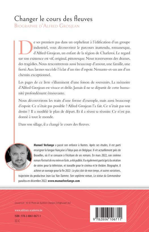 Un parcours inattendu, romanesque. Alfred Grosjean est un enfant de la région de Charleroi. De ses premiers pas dans un orphelinat à l’édification d’un groupe industriel, la démarche a été longue. Le chemin exceptionnel. 91  ans ont passé. Le regard sur son existence est vif, original, pittoresque. Drames, tragédies. Mais aussi beaucoup d’amour, une famille, une fierté. Aux larmes succède l’éclat d’un rire d’espoir. Mémoire sensible, vivace, drôle. Les pages de ce livre s’illuminent d’une foison d’images, de souvenirs. Alfred Grosjean a réussi sa réussite. Ce n’est pas donné à tout le monde, beaucoup de réussites sont des échecs. Dans son sillage, il a changé le cours des fleuves.