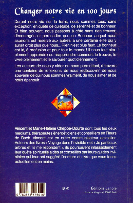 Durant notre vie sur la terre, nous sommes tous, sans exception, en quête de quiétude, de sérénité et de bonheur. Et bien souvent, nous passons à côté sans rien trouver, découragés et persuadés que ce Bonheur auquel nous aspirons est réservé aux autres, à une certaine élite qui y aurait droit plus que nous… Rien n’est plus faux. Le bonheur est là, à profusion et pour tout le monde! Il nous faut simplement apprendre ou réapprendre comment le trouver, le vivre pleinement et le savourer quotidiennement. Les auteurs peuvent nous y aider en nous permettant, à travers une centaine de réflexions, de nous redécouvrir, de nous souvenir de qui nous sommes vraiment, de nous aimer et de nous épanouir.