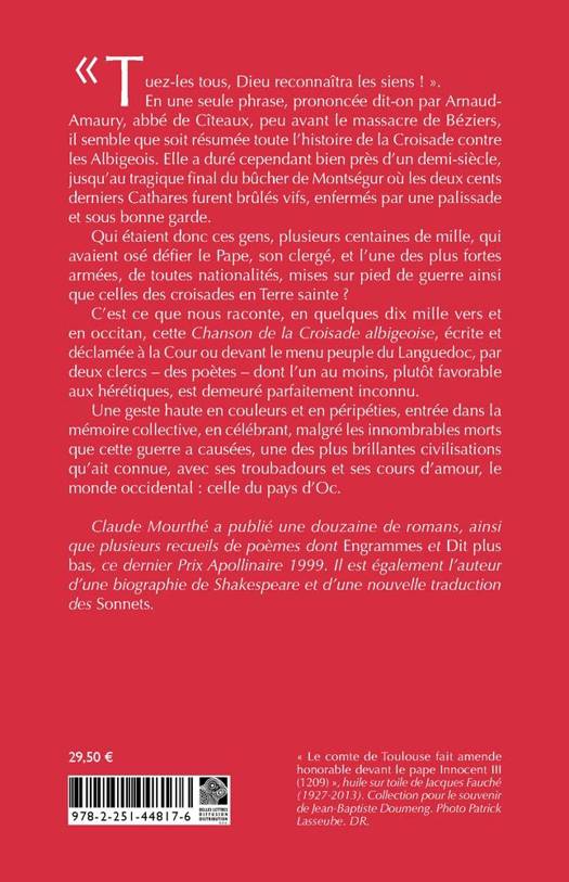 "Tuez-les tous, Dieu reconnaitra les siens!". En une seule phrase, prononcee dit-on par Arnaud-Amaury, abbe de Citeaux, peu avant le massacre de Beziers, il semble que soit resumee toute l'histoire de la Croisade contre les Albigeois. Elle a dure cependant bien pres d'un demi-siecle, jusqu'au tragique final du bucher de Montsegur ou les deux cents derniers Cathares furent brules vifs, enfermes par une palissade et sous bonne garde. Qui etaient donc ces gens, plusieurs centaines de mille, qui avaient ose defier le Pape, son clerge, et l'une des plus fortes armees, de toutes nationalites, mises sur pied de guerre ainsi que celles des croisades en Terre sainte? C'est ce que nous raconte, en quelques dix mille vers et en occitan, cette Chanson de la Croisade albigeoise, ecrite et declamee a la Cour ou devant le menu peuple du Languedoc, par deux clercs - des poetes - dont l'un au moins, plutot favorable aux heretiques, est demeure parfaitement inconnu. Une geste haute en couleurs et en peripeties, entree dans la memoire collective, en celebrant, malgre les innombrables morts que cette guerre a causees, une des plus brillantes civilisations qu'ait connue, avec ses troubadours et ses cours d'amour, le monde occidental: celle du pays d'Oc.
