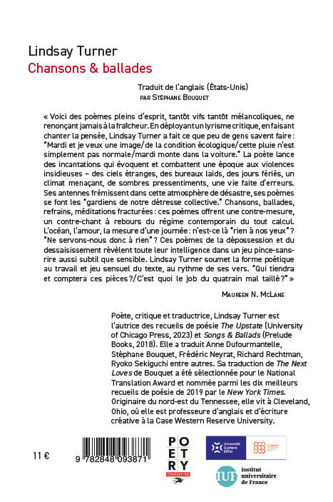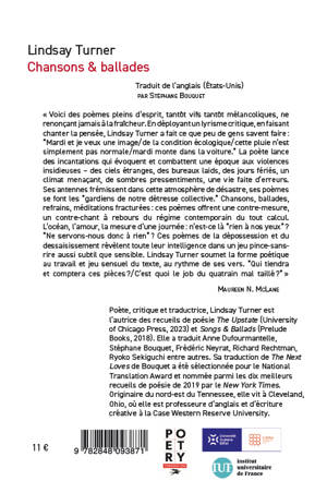 Lindsay Turner a réalisé un exploit rare avec ses poèmesâ: ils sont à la fois spirituels, incisifs, et empreints de désespoir, mais étrangement revigorants. En rendant la poésie critique, elle transforme les mots en musique pour l’esprit. <br /> Lindsay Turner est poète et traductrice (Ryoko Sekiguchi, Stéphane Bouquet, Anne Dufourmantelle, Richard Rechtman, Liliane Giraudon, autres). Elle a publié dans de nombreuses revues (Lana Turner Journal, The New York Review of Books, Boston Review, Kenyon Review). Son premier recueil de poèmes, Songs & Ballads, a paru en 2018 chez Prelude Books et son deuxième, THE Upstate, a paru chez The University of Chicago Press à l'automne 2023. Elle est docteur d’anglais de l’Université de Virginie et vit actuellement à Cleveland, Ohio, où elle enseigne à Case Western Reserve University.