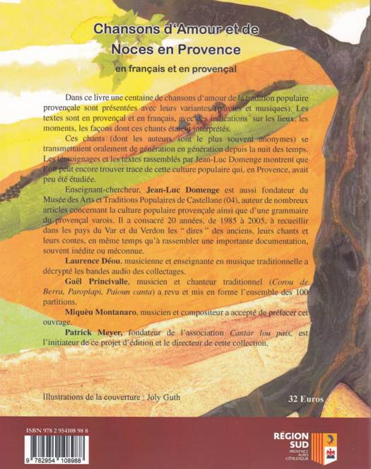 Chansons d'amour heureux ou contrarié, chansons de bergères, chansons de noces ou de mal-mariées, chants licencieux, voilà la matière de ces deux livres : "Chansons d'amour en Provence", et "Chansons d'amour et de noces en Provence". Ce second livre ("Chansons d'amour et de noces en Provence") contient 61 chansons populaires de tradition orale recueillies par Jean Luc Domenge auprès des anciens, entre les Alpes provençales d'Italie et la vallée du Rhône. Le répertoire est bilingue : provençal-français. Tous les chants en provençal sont traduits. Laurence Déou et Gaël Princivalle ont écouté les enregistrements de Jean Luc Domenge et en ont écrit avec soin les partitions. Les chansons pouvant prendre des formes différentes (pour les paroles comme pour les musiques) cela explique les 100 partitions et les différentes versions.