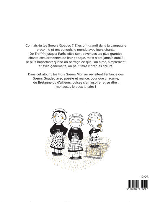 Connais-tu les SÅurs Goadec ? Elles ont grandi dans la campagne bretonne et ont conquis le monde avec leurs chants. De Treffrin jusqu'à Paris, elles sont devenues les plus grandes chanteuses bretonnes de leur époque, mais n'ont jamais oublié le plus important : quand on partage ce que l'on aime, simplement et avec générosité, on peut faire vibrer les cÅurs. Dans cet album, les trois SÅurs Morizur revisitent l'enfance des SÅurs Goadec avec poésie et malice, pour que d'autres enfants, de Bretagne ou d'ailleurs, puissent s'en inspirer et se dire : moi aussi, je peux le faire !