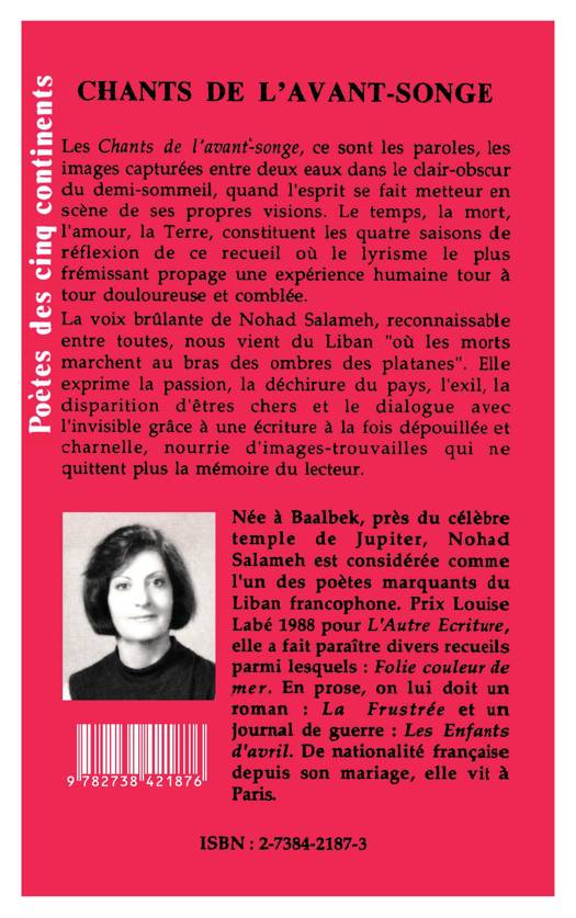 Nohad Salameh est considérée comme l'un des poètes marquant du Liban francophone. Sa voix brûlante nous vient de l'Orient. Elle exprime la passion, la déchirure du pays, l'exil, la disparition des êtres chers...