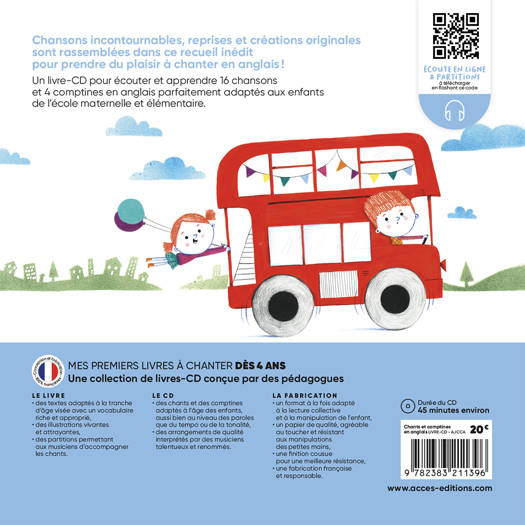 Un livre-CD pour écouter et apprendre 16 chansons et 4 comptines en anglais parfaitement adaptés aux enfants de l'école maternelle et élémentaire. LES PLUS Des paroles et des musiques adaptées à l’âge de l’enfant Des illustrations vivantes réalisées par la talentueuse Mélanie Grandgirard Un CD et un QR Code pour écouter les chants et comptines Une fabrication de qualité, parfaite pour les petites mains Un livre adapté à la lecture adulte-enfant pour un moment privilégié Une conception éthique et engagée