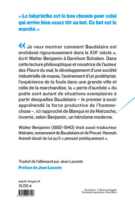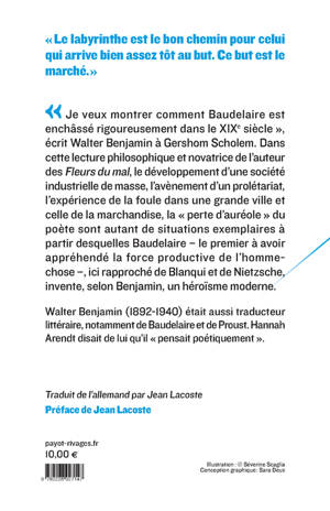 "Je veux montrer comment Baudelaire est enchâssé rigoureusement dans le XIXè siècle", écrit Walter Benjamin à Gershom Scholem. Dans cette lecture philosophique et novatrice de l'auteur des Fleurs du mal, le développement d'une société industrielle de masse, l'avènement d'un prolétariat, l'expérience de la foule dans une grande ville et celle de la marchandise, la "perte d'auréole" du poète sont autant de situations exemplaires à partir desquelles Baudelaire - le premier à avoir appréhendé la force productive de l'homme-chose -, ici rapproché de Blanqui et de Nietzsche, invente, selon Benjamin, un héroïsme moderne.