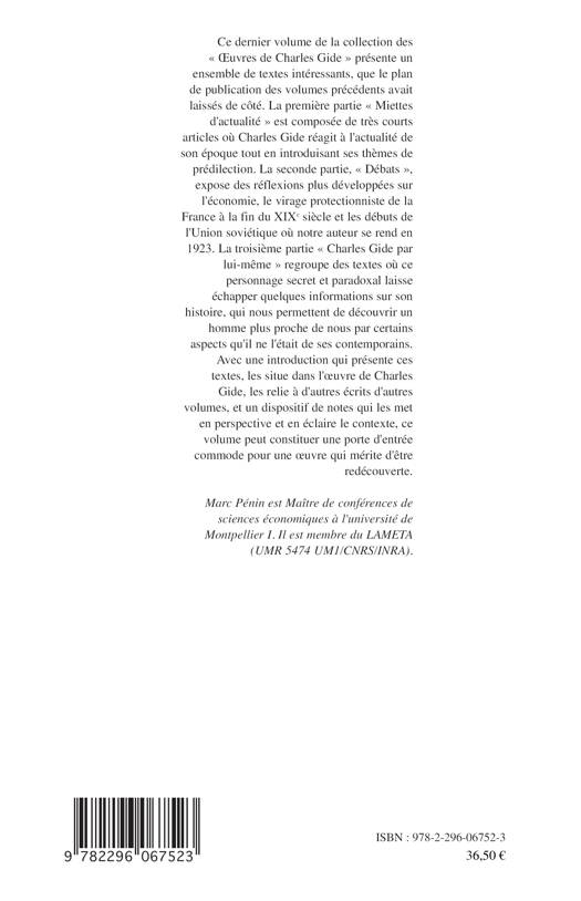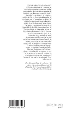 Ce dernier volume de la collection des "Oeuvres de Charles Gide" présente un ensemble de textes intéressants laissés de côté par le plan de publication des volumes précédents : les réactions de l'auteur face à l'actualité de son époque ; ses réflexions approfondies sur l'économie, le virage protectionniste de la France à la fin du XIXe siècle et les débuts de l'Union soviétique ; ou encore des textes plus personnels.