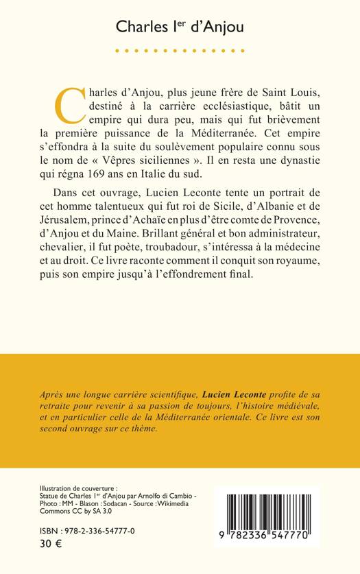 Charles d’Anjou, plus jeune frère de Saint Louis, destiné à la carrière ecclésiastique, bâtit un empire qui dura peu, mais qui fut brièvement la première puissance de la Méditerranée. Cet empire s’effondra à la suite du soulèvement populaire connu sous le nom de « Vêpres siciliennes ». Il en resta une dynastie qui régna 169 ans en Italie du sud. Dans cet ouvrage, Lucien Leconte tente un portrait de cet homme talentueux qui fut roi de Sicile, d’Albanie et de Jérusalem, prince d’Achaïe en plus d’être comte de Provence, d’Anjou et du Maine. Brillant général et bon administrateur, chevalier, il fut poète, troubadour, s’intéressa à la médecine et au droit. Ce livre raconte comment il conquit son royaume, puis son empire jusqu’à l’effondrement final.