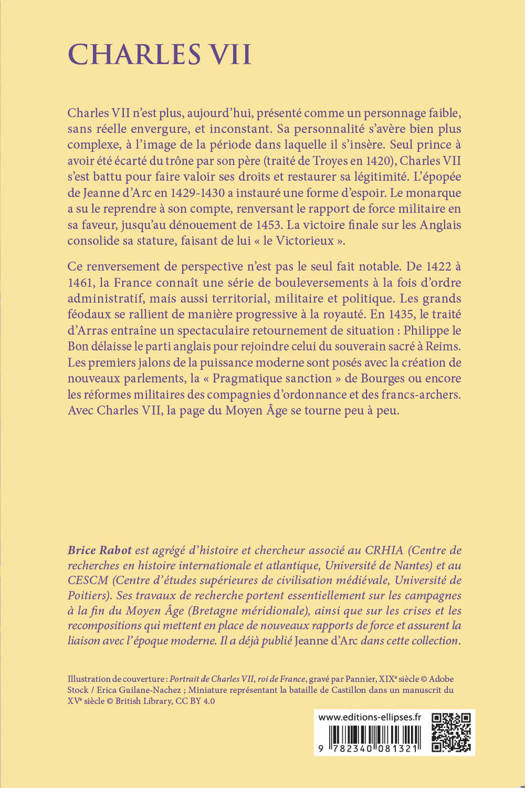 Brice Rabot est agrégé d’histoire et chercheur associé au CRHIA (Centre de recherches en histoire internationale et atlantique, Université de Nantes) et au CESCM (Centre d’études supérieures de civilisation médiévale, Université de Poitiers). Ses travaux de recherche portent essentiellement sur les campagnes à la fin du Moyen Âge (Bretagne méridionale), ainsi que sur les crises et les recompositions qui mettent en place de nouveaux rapports de force et assurent la liaison avec l’époque moderne. Il a déjà publié Jeanne d’Arc dans cette collection.