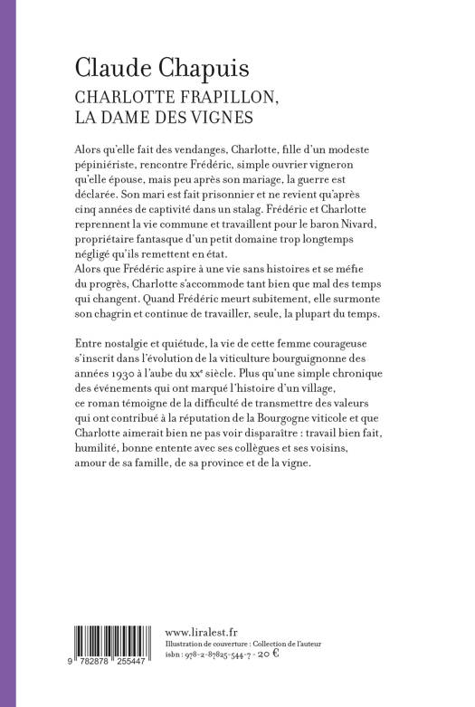 Alors qu'elle fait des vendanges, Charlotte, fille d'un modeste pépiniériste, rencontre Frédéric, simple ouvrier vigneron qu'elle épouse, mais peu après son mariage, la guerre est déclarée. Son mari est fait prisonnier et ne revient qu'après cinq années de captivité dans un stalag. Frédéric et Charlotte reprennent la vie commune et travaillent pour le baron Nivard, propriétaire fantasque d'un petit domaine trop longtemps négligé qu'ils remettent en état. Alors que Frédéric aspire à une vie sans histoires et se méfie du progrès, Charlotte s'accommode tant bien que mal des temps qui changent. Quand Frédéric meurt subitement, elle surmonte son chagrin et continue de travailler, seule, la plupart du temps. Entre nostalgie et quiétude, la vie de cette femme courageuse s'inscrit dans l'évolution de la viticulture bourguignonne des années 1930 à l'aube du XXe siècle. Plus qu'une simple chronique des événements qui ont marqué l'histoire d'un village, ce roman témoigne de la difficulté de tran